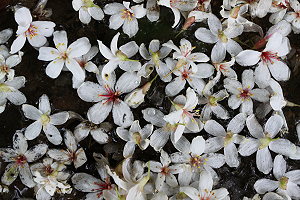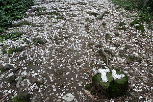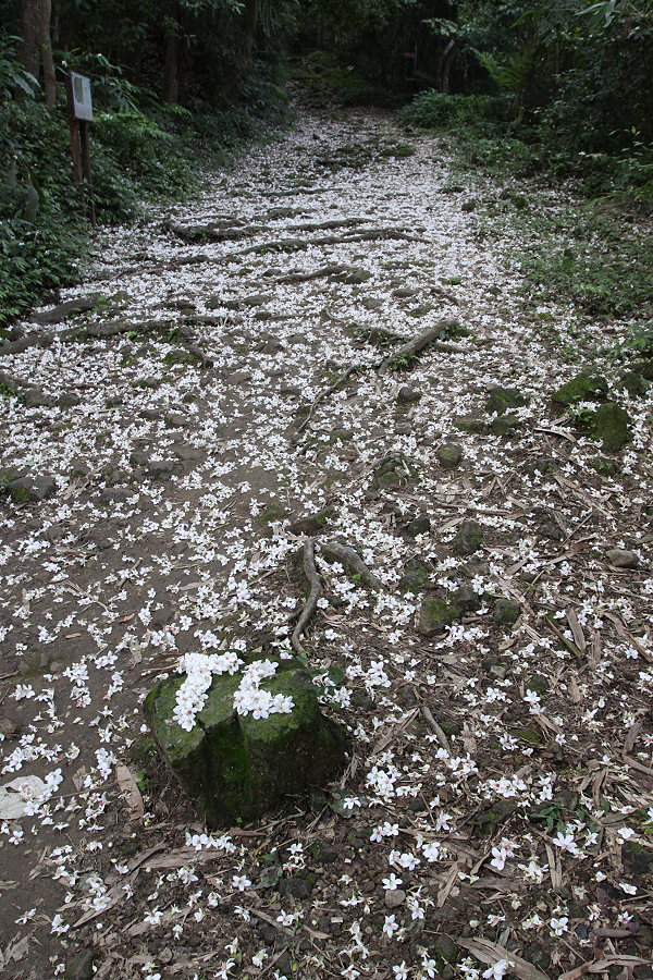 油桐花季,清晨時分滿地的白雪,連登山客也捨不得踩著小白花上山。(2009-4-29 大芎宮古道)